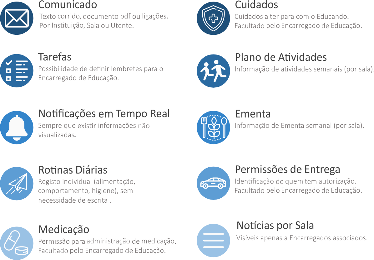 Toda informação entre Instituição e Encarregado de Educação com estados associados (entregue, lido, respondido), que permite à Instituição a confirmação de que o Encarregado recebeu e leu os comunicados/avisos.